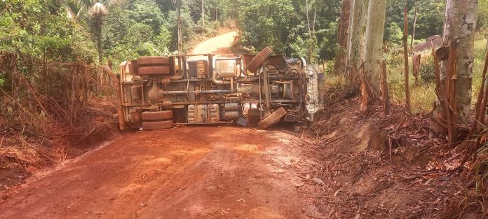 De acordo com informações apuradas, o condutor do veículo perdeu o controle da direção enquanto trafegava pela estrada vicinal, fazendo com que o caminhão tombasse às margens da via.