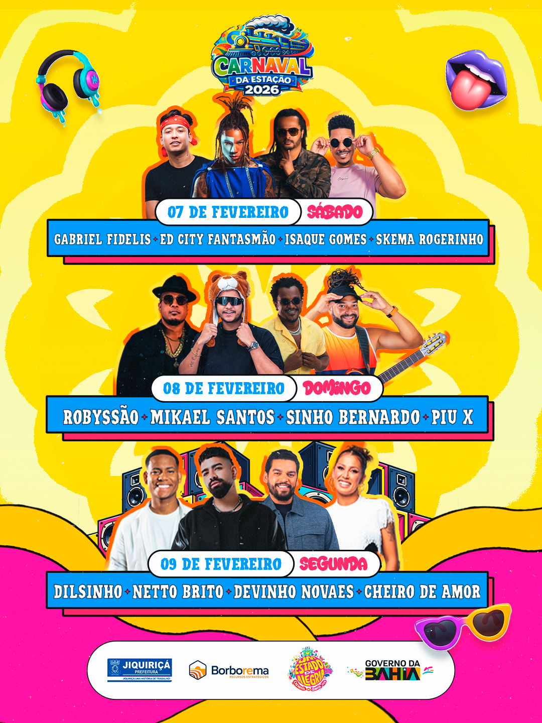A Prefeitura de Jiquiriçá divulgou oficialmente a programação do Carnaval da Estação 2026, que será realizado entre os dias 7,8 e 9 de fevereiro, na Praça da Estação. O evento promete três dias de muita música, alegria e valorização da cultura popular, reunindo grandes atrações do cenário regional e nacional.