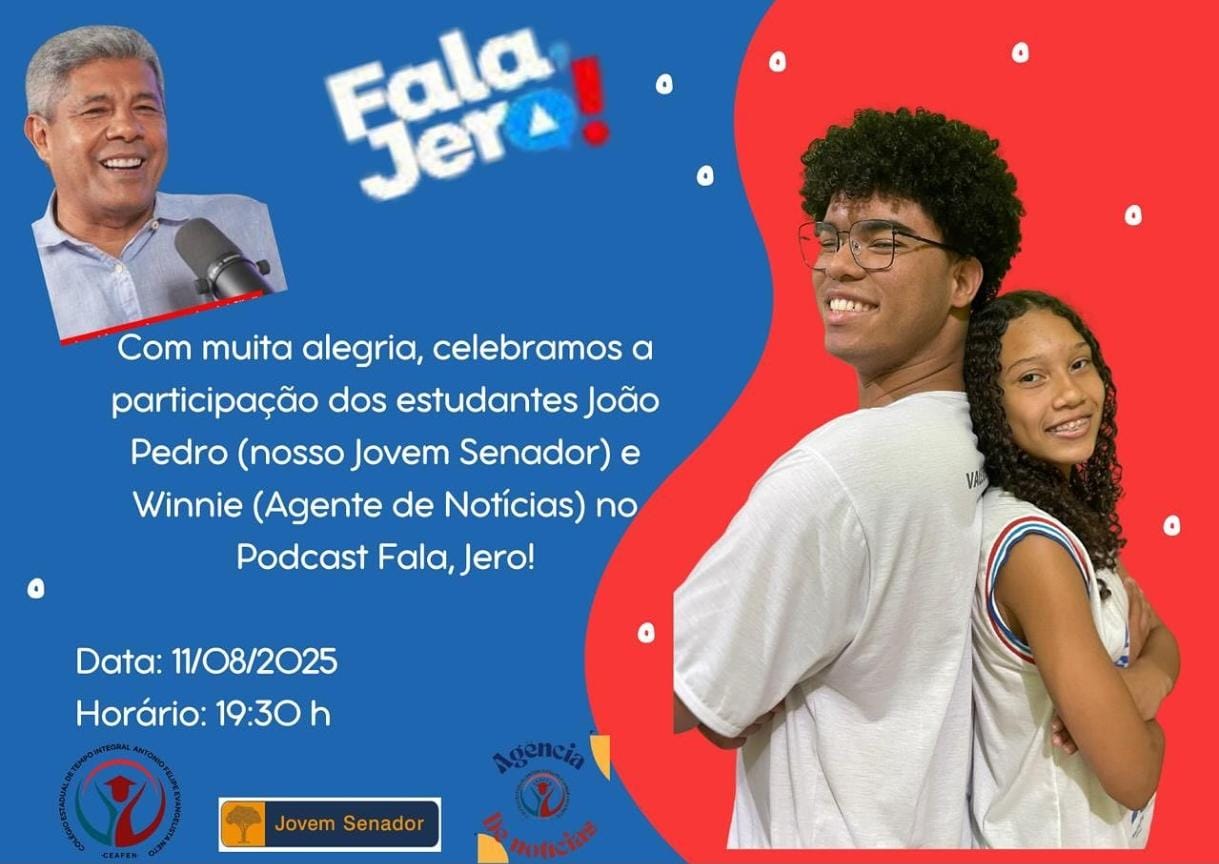 O estudante João Pedro Ferreira Santos, de apenas 17 anos, tem muito a dizer — e agora terá a oportunidade de fazer isso diretamente do Senado Federal, em Brasília. Natural de Mutuípe, no Vale do Jiquiriçá, o jovem foi selecionado para representar a Bahia no programa Jovem Senador 2025. Em um bate-papo descontraído e simbólico com o governador Jerônimo Rodrigues, durante o podcast “Fala, Jerô”, João deu voz à juventude baiana e mostrou maturidade ao tratar de temas como meio ambiente, educação e responsabilidade social.