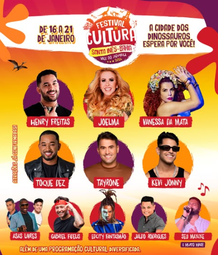 Com uma programação diversificada, o evento acontece entre os dias 16 e 21 de janeiro, transformando Santa Inês em um grande palco cultural.com valorização dos artistas locais e artistas que prometem momentos inesquecíveis para o público: