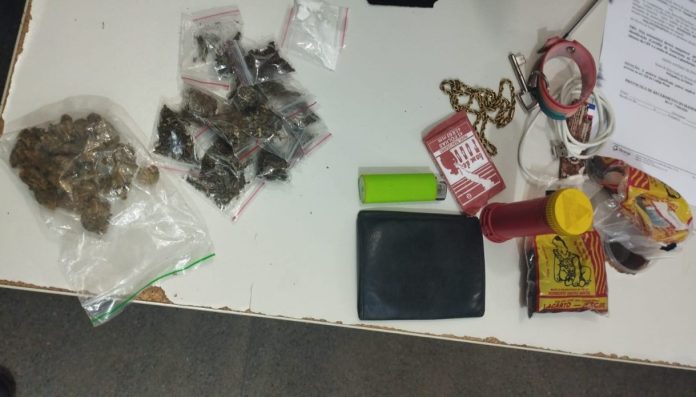De acordo com os policiais, foram apreendido aproximadamente 20 gramas de substância semelhante à maconha e 2 gramas de substância análoga à cocaína. Também foram recolhidos uma corrente dourada, um aparelho celular e um relógio.