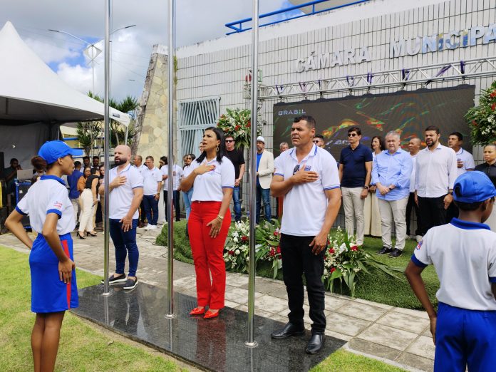 Ao som da fanfarra da cidade, o grupo seguiu até a sede da prefeitura, onde ocorreu o hasteamento das bandeiras e o anúncio de um investimento de R$ 1,2 milhão para a modernização do Estádio Municipal de Laje.