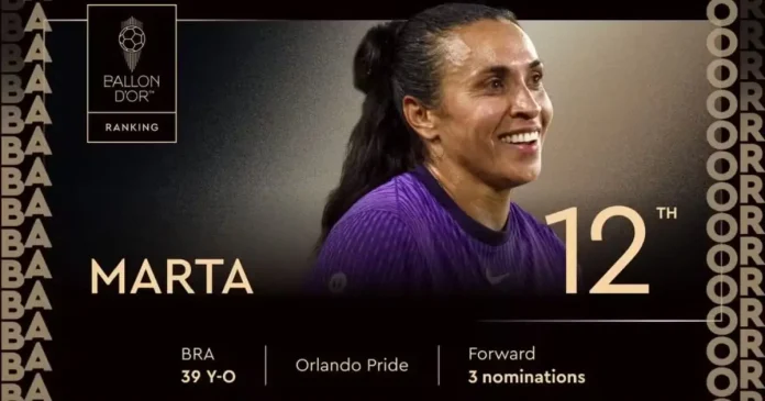 Antes da cerimônia da Bola de Ouro realizada pela revista France Football, nesta segunda-feira (22), foi revelado que a atacante brasileira Marta ficou com o 12º lugar na disputa do prêmio. Os organizadores começaram a divulgar as posições dos candidatos que fazem parte do Top30 nesta manhã.