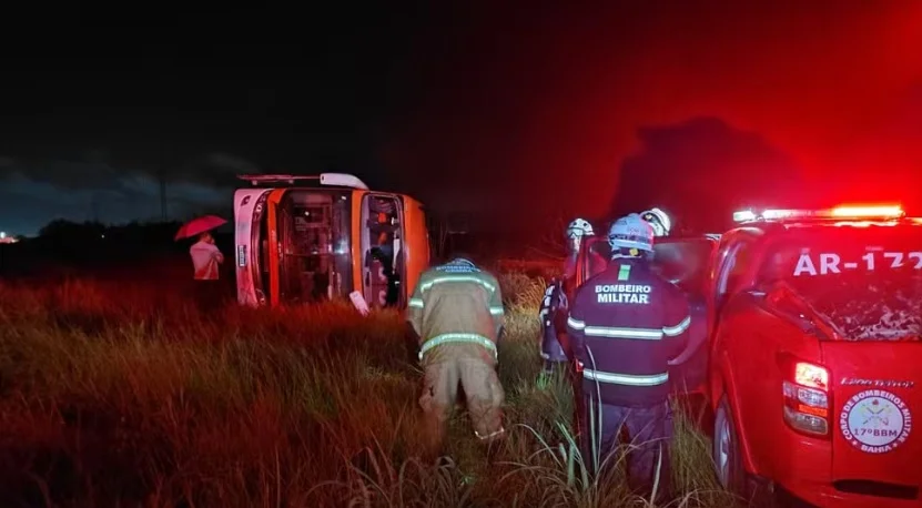 Um ônibus que transportava 42 passageiros tombou na madrugada desta quarta-feira (11) na BR-020, no município de São Desidério, oeste da Bahia. Não houve mortes, segundo informou a Polícia Rodoviária Federal (PRF).