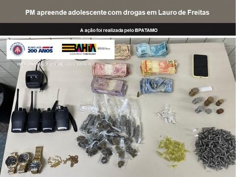 Na manhã deste domingo (5), policiais militares Batalhão de Patrulhamento Tático Móvel (BPATAMO), apreenderam um adolescente com drogas, na Rua Alice Uzeda, em Lauro de Freitas.