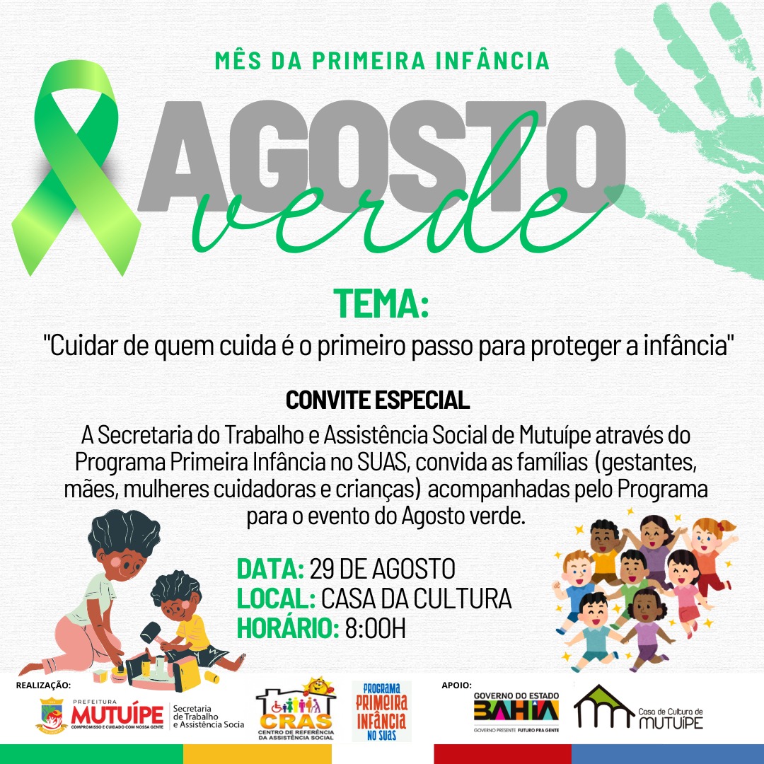 A Secretaria do trabalho e Assistência Social através do Programa Primeira Infância no SUAS convida as famílias beneficiárias do Programa Primeira Infância no SUAS para o evento de culminância do Agosto verde mês da Primeira Infância com o tema: “Cuidar de quem cuida é o primeiro passo para proteger a infância” dia 29 de agosto de 2025 na casa de cultura de Mutuípe ????✨